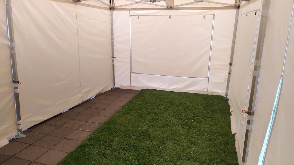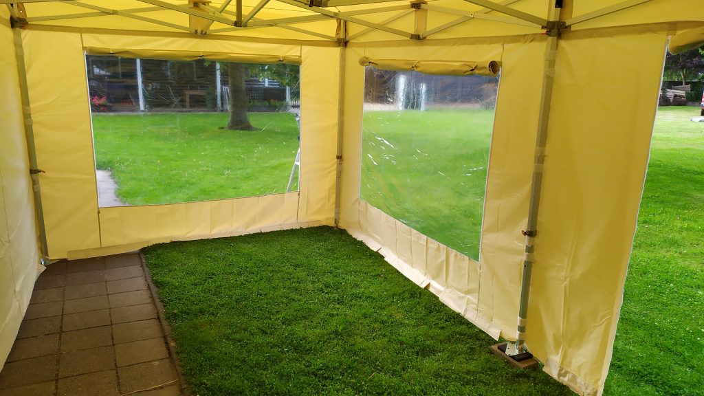 De tent heeft losse wanden en kan aan alle zijden open en geheel of gedeeltelijk worden gesloten. De tent is tevens in hoogte verstelbaar. Deze luxe catering tent / promotie tent of verkoop tent is in twee kleuren verkrijgbaar: Ercu en zilvergroen.